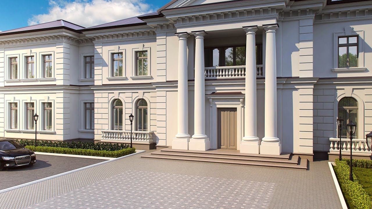 С внутренней стороны земельного участка при строительстве дома была расположена длинная галерея с панорамным остеклением. Плоская кровля галереи, сопряженная с балконами второго этажа, представляет собой большую открытую террасу для отдыха, с которой открывается прекрасный вид на окружающие особняк окрестности. В процессе строительства домов в классическом стиле особое внимание уделяется отделке фасадных плоскостей и элементам экстерьера, которые несут на себе декоративную нагрузку. Особое место при формировании декора индивидуального дома отведено лепной рустике.