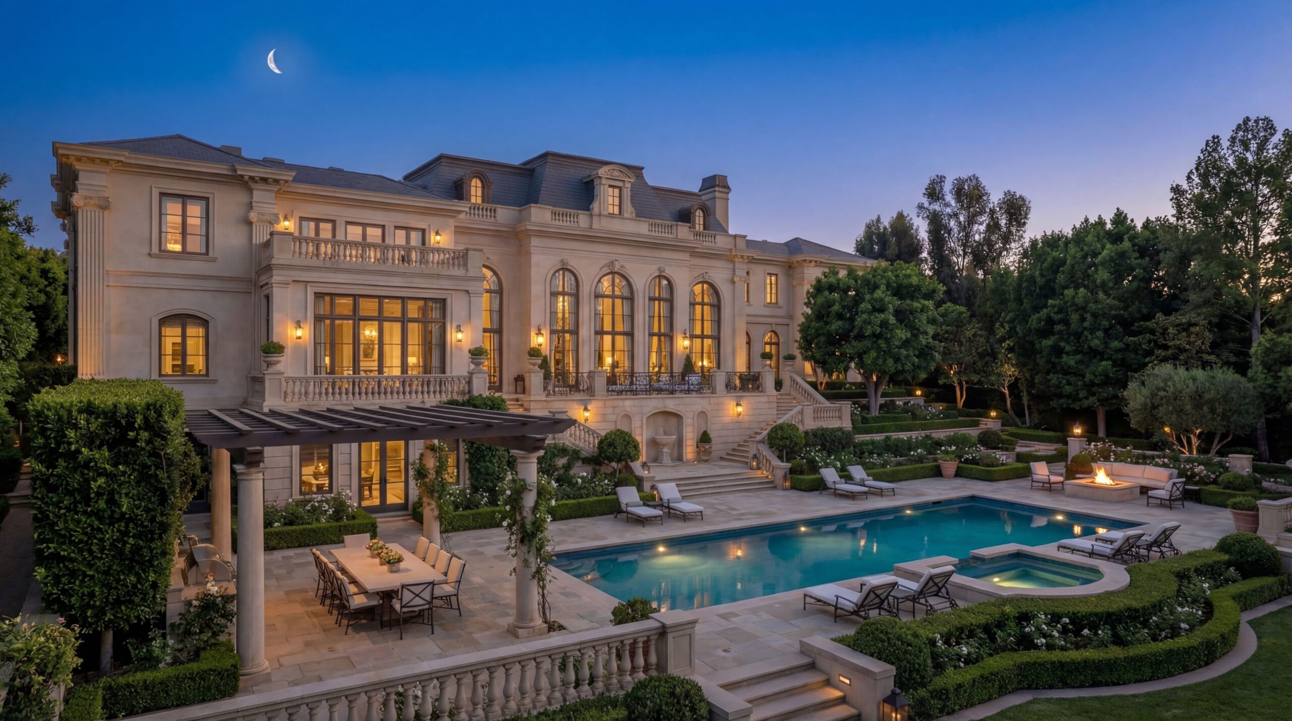 Ландшафтное и архитектурное решения работают как единое целое, формируя парадное пространство для отдыха и приёма гостей. Вечерняя подсветка подчёркивает глубину фасадов и усиливает выразительность форм.